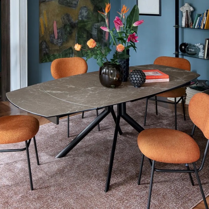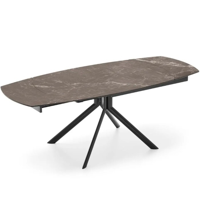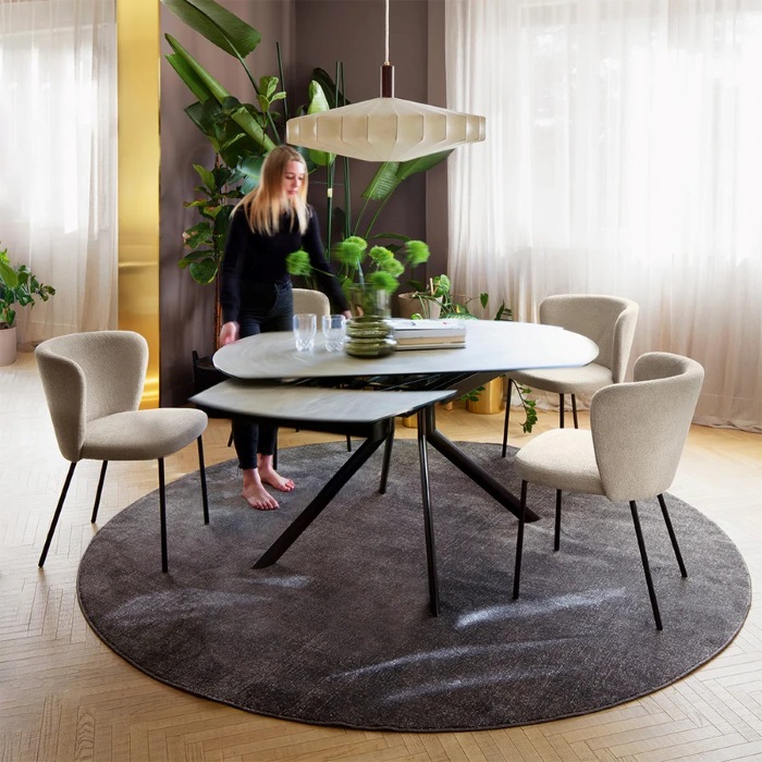 Ovālas formas izvelkams galds, kas labi izskatās gan dzīvojamās istabas interjerā, gan lieliski kalpo kā ēdamistabas vai virtuves galds.