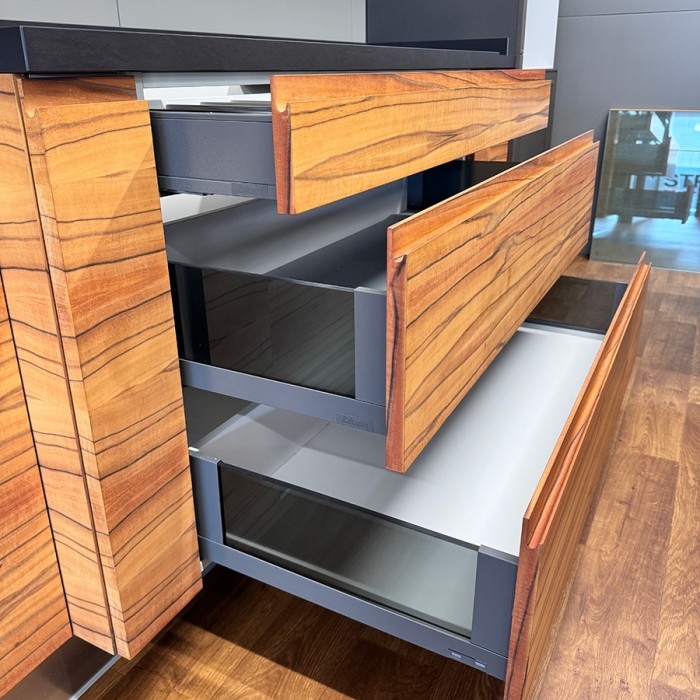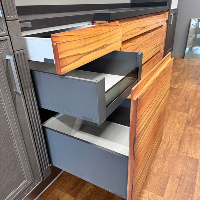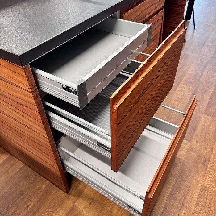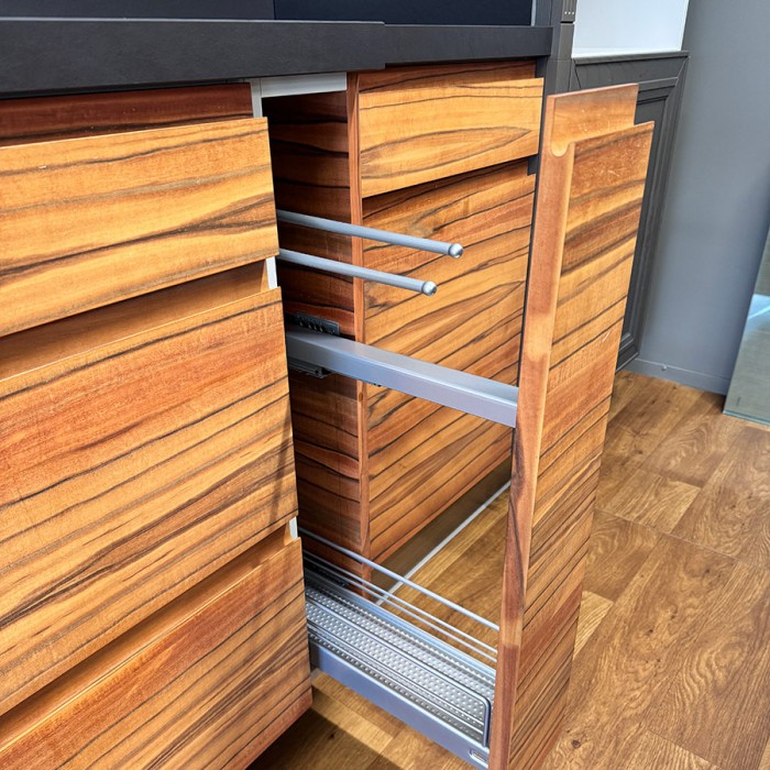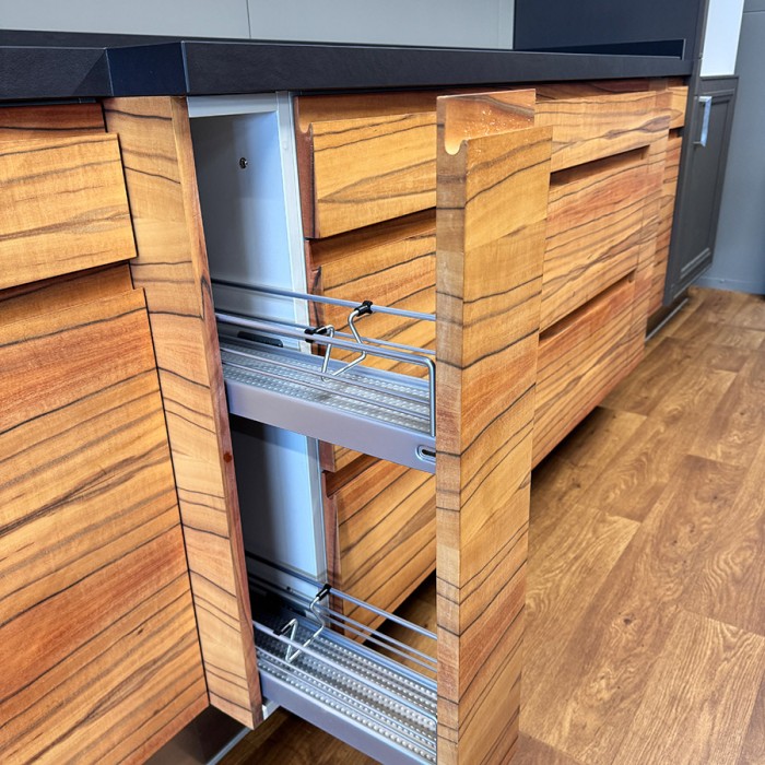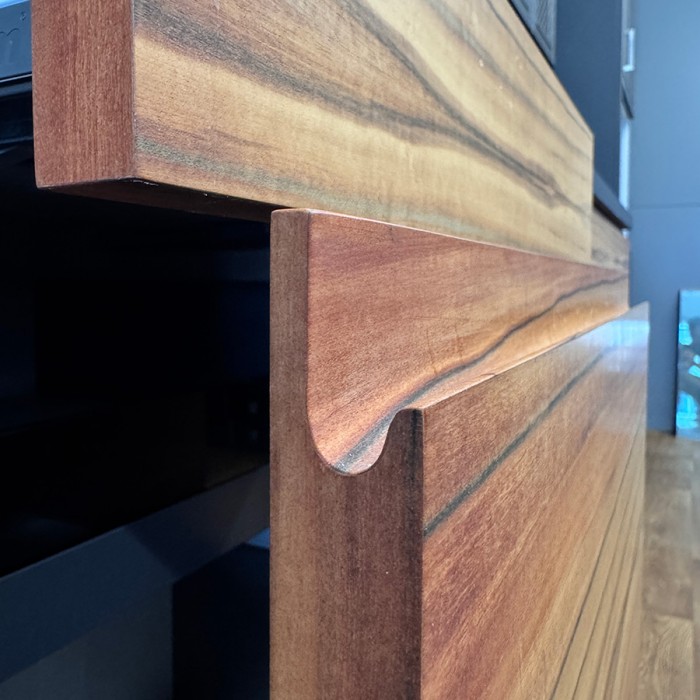 - Fasādes un korpusu redzamās daļas – 19mm dabīgais finierējums Indijas ābele.