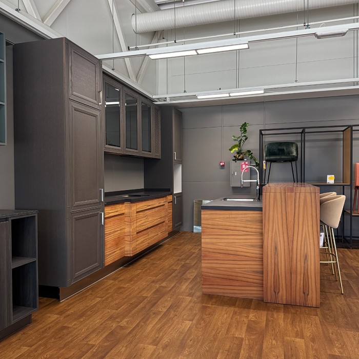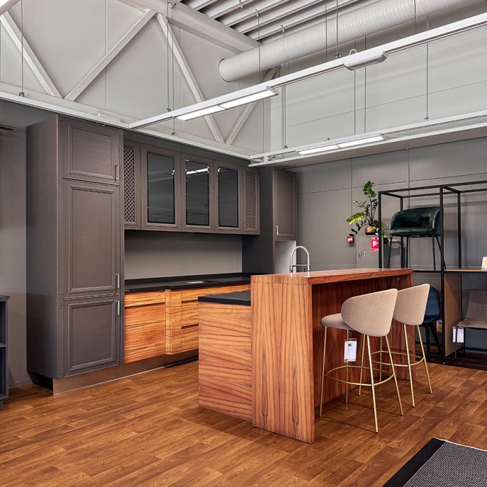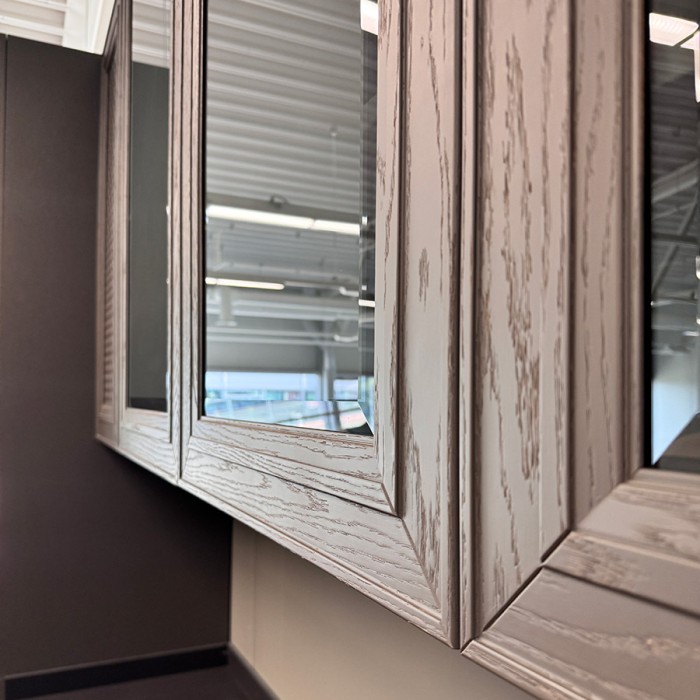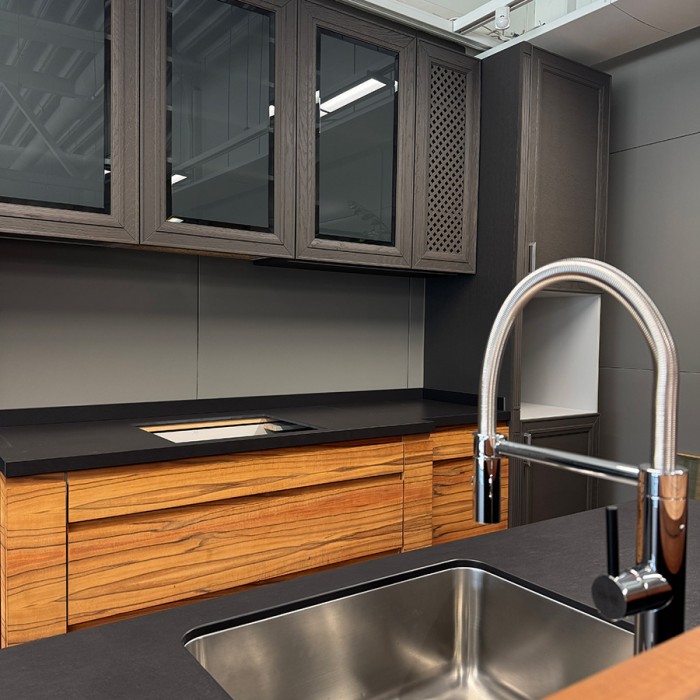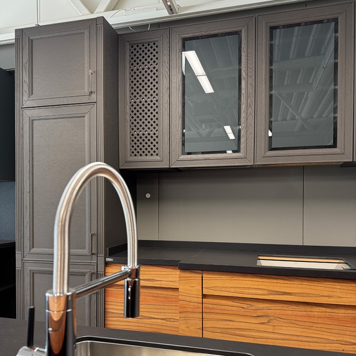 - Fasādes sienas skapīšiem – krāsots ozola masīvkoks un finierējums.